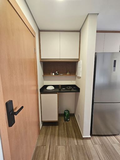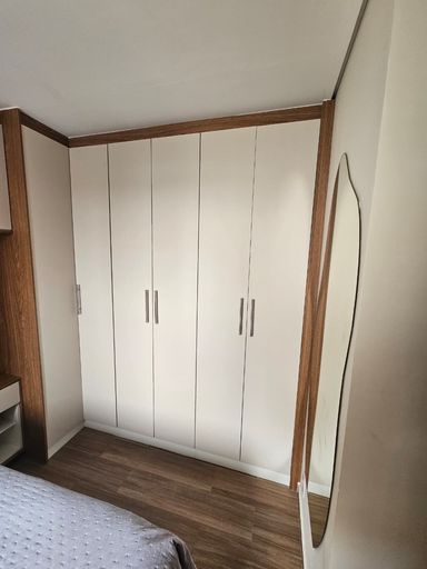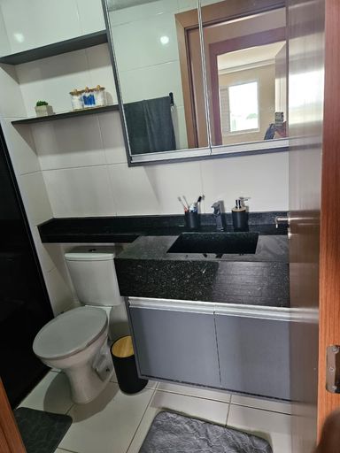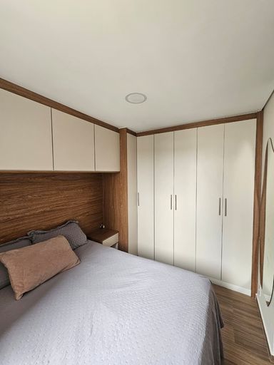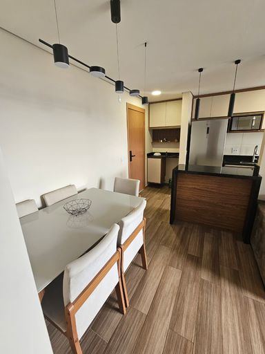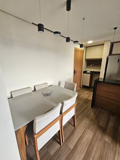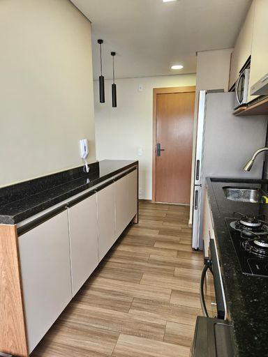 Apartamento possui piso laminado, sanca de gesso com iluminação embutida, com planejados em todos os ambientes e bancada em mármore na cozinha, banheiro com box de vidro e acabamento de mármore.