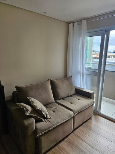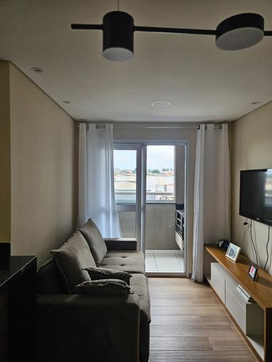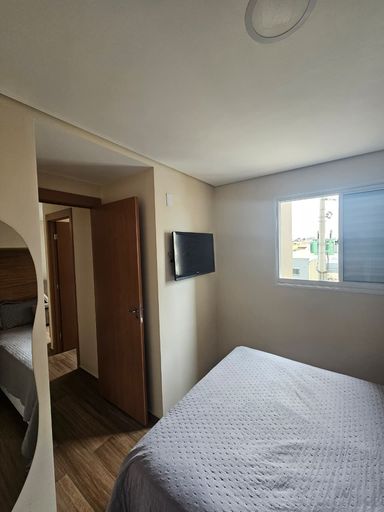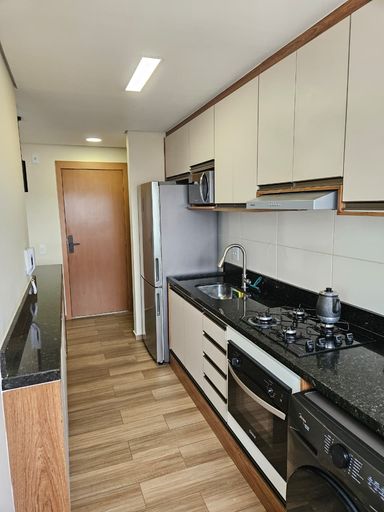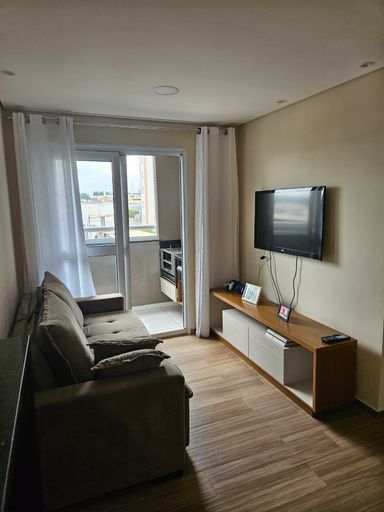 O imóvel dispõe de 02 dormitórios, sala de estar integrada à varanda, cozinha, banheiro social, área de serviço e 01 vaga de garagem